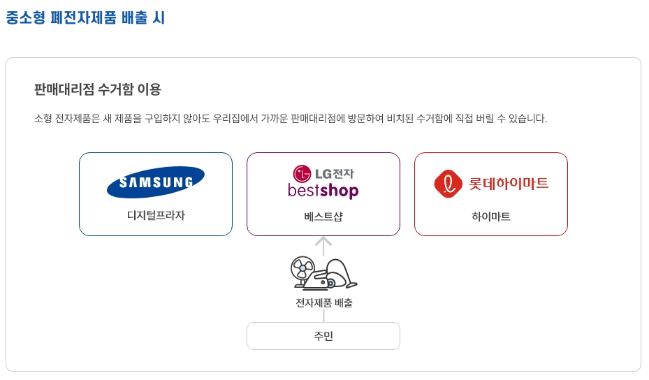 가까운 삼성 디지털 프라자, 엘지전자 베스트샵, 롯데 하이마트를 이용해서 수거함에 직접 버릴 수 있습니다. 이곳에서 샀던 물건일 필요는 없습니다.