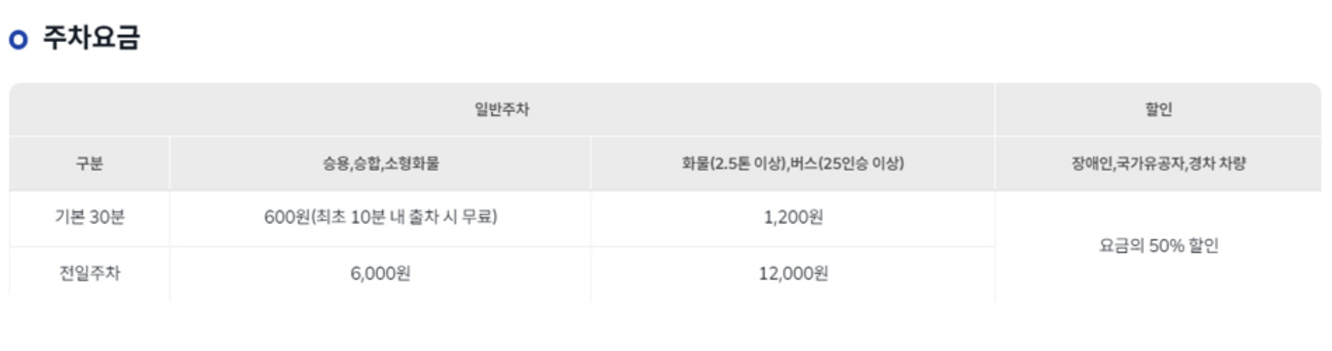 가장 중요한 주차 요금 정보입니다. 기본적으로 30분 주차시 600원이며 10분 내 출차시 요금을 부과하지 않습니다. 승용차의 경우 전일 주차를 하면 600원입니다.